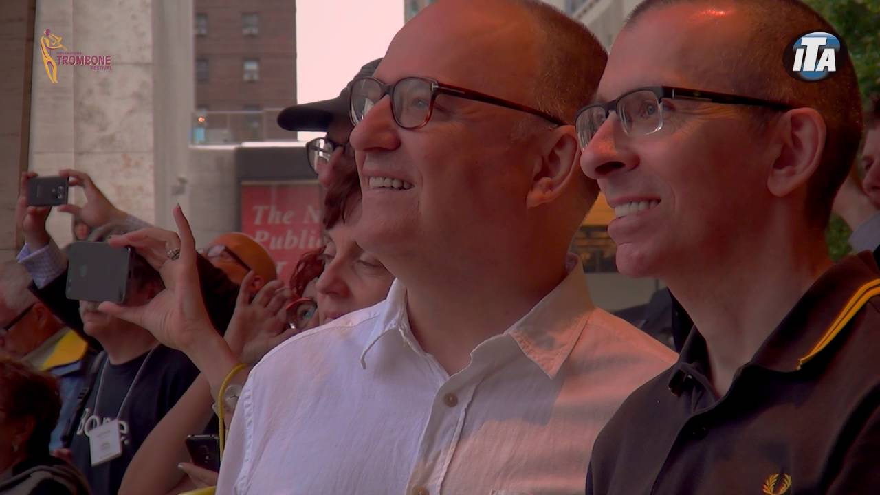 Phil Meyers, the principal horn, seemed transfixed by the trombone player in front of him. When we asked him why, he said he was trying to copy the slide positions…Do check out the International Trombone Festival´s video (here in the Outtakes) of the whole thing and I especially love the aerial shots where you can see just how many of us were out there.